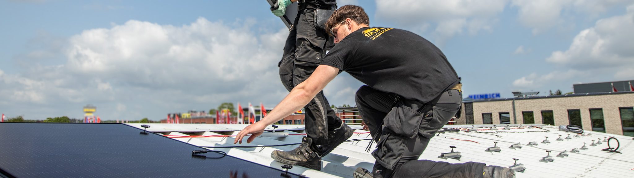 Zwei Monteure von Nordic Sunpower auf einem Hausdach, einer trägt ein Solarmodul.